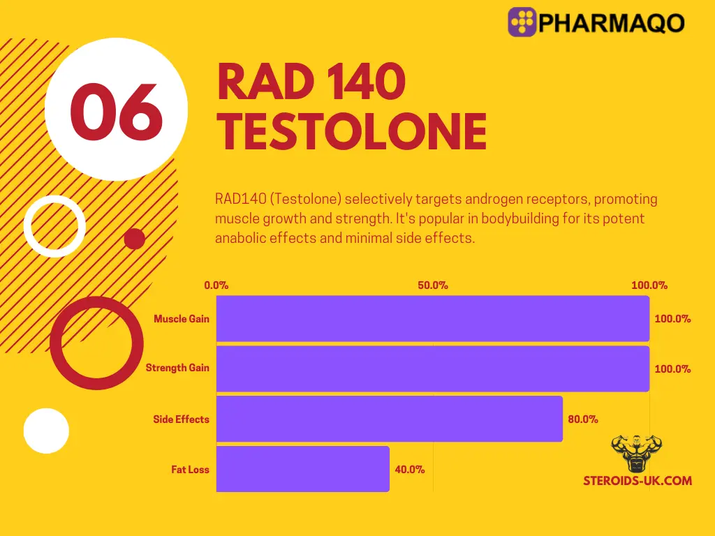 Muscle Growth: RAD-140 helps increase lean muscle mass by targeting androgen receptors in muscle tissue, promoting significant muscle development and strength gains.